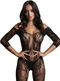 Förförisk kroppsstrumpa med vackra spetsmönster, hög halsringning och öppen gren.