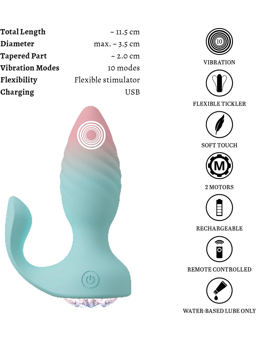 Pluggen är utrustad med två tysta men kraftfulla motorer som erbjuder 10 vibrationslägen – från mjuka pirrningar till djupa pulser. Den flexibla yttre armen smeker mellangården samtidigt som pluggen ger intensiv stimulans invändigt.