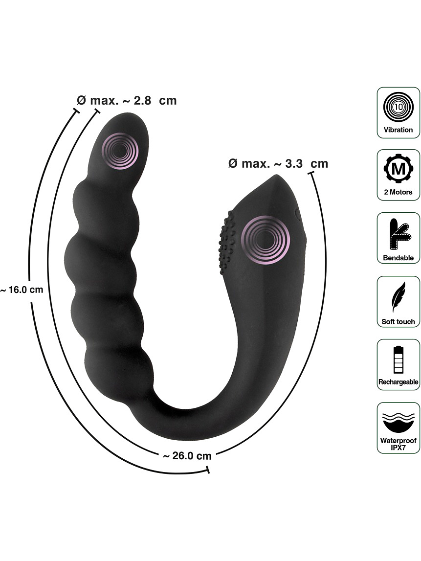 Upplev dubbel stimulans med Bendable Dual Stimulator – en böjbar och kraftfull dubbelvibrator som kombinerar två sensuella funktioner i en innovativ design. Det kulformade skaftet stimulerar invändigt medan den knottriga delen stimulerar utvändigt - för maximal njutning, ensam eller tillsammans med en partner.