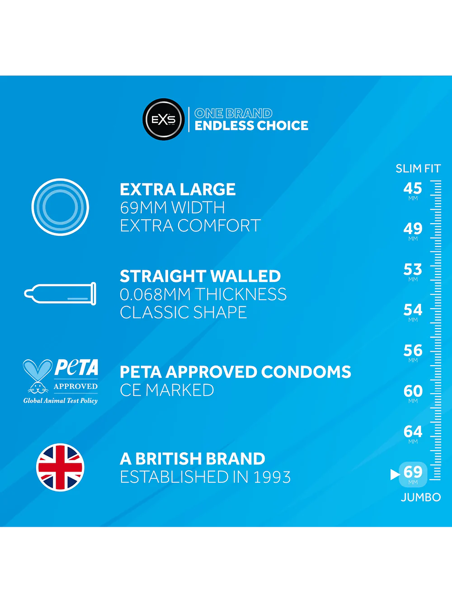 För högsta säkerhet är det viktigt att använda en kondom med bra passform för just dig. Om du upplever att vanliga eller något större kondomer är för trånga och behöver en ännu större kondom är EXS Jumbo perfekt för dig.
