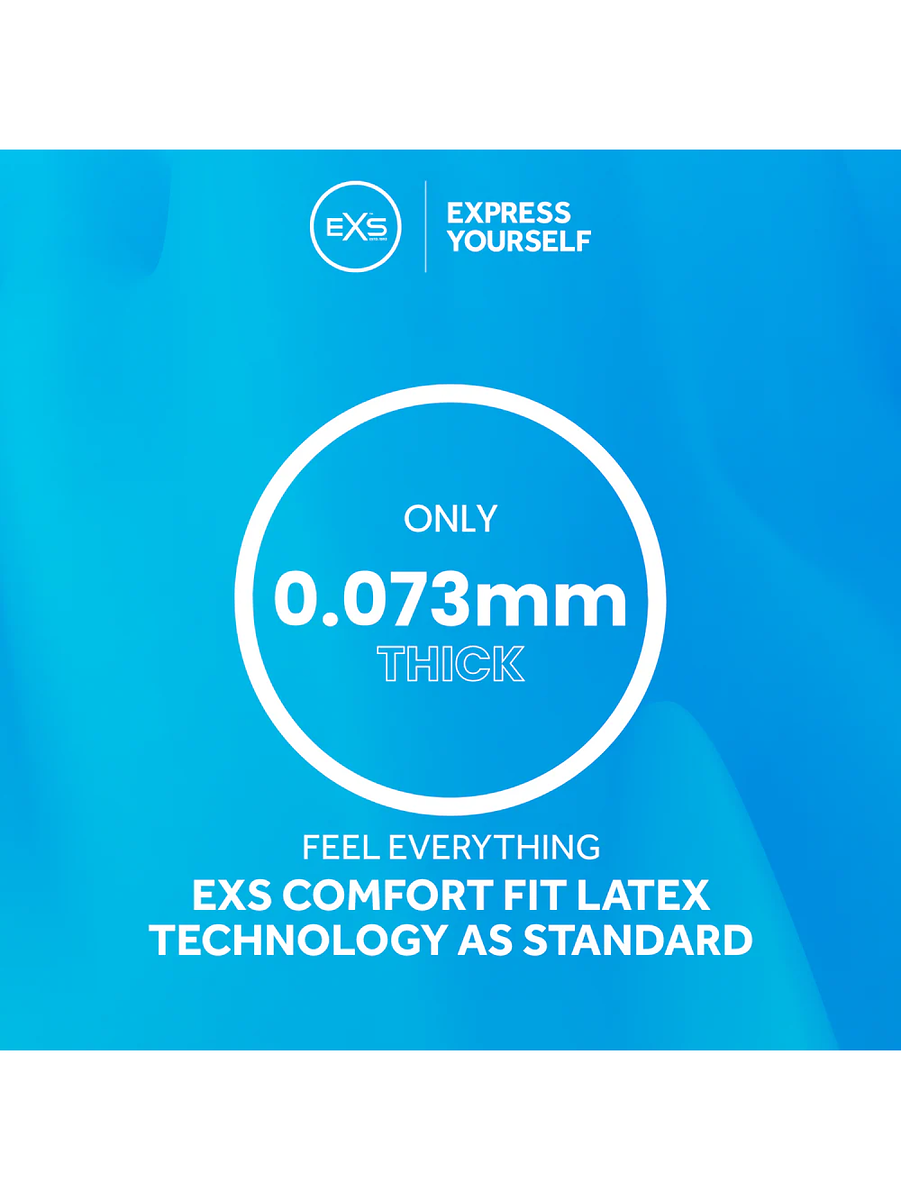 EXS kondomer är tillverkade i högkvalitativ latex och glidmedelsbehandlade för en minskad friktion och skönare känsla. Kondomerna har ingen latexlukt, är lätta att ta på och extremt sköna att bära. De är dessutom veganvänliga och givetvis elektroniskt testade för extra säkerhet.