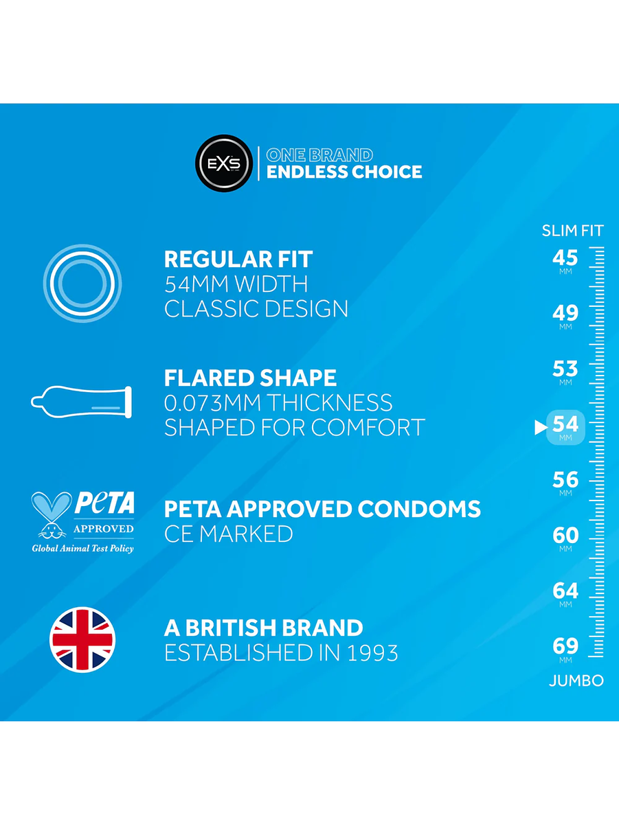 EXS kondomer är tillverkade i högkvalitativ latex och glidmedelsbehandlade för en minskad friktion och skönare känsla. Kondomerna har ingen latexlukt, är lätta att ta på och extremt sköna att bära. De är dessutom veganvänliga och givetvis elektroniskt testade för extra säkerhet.