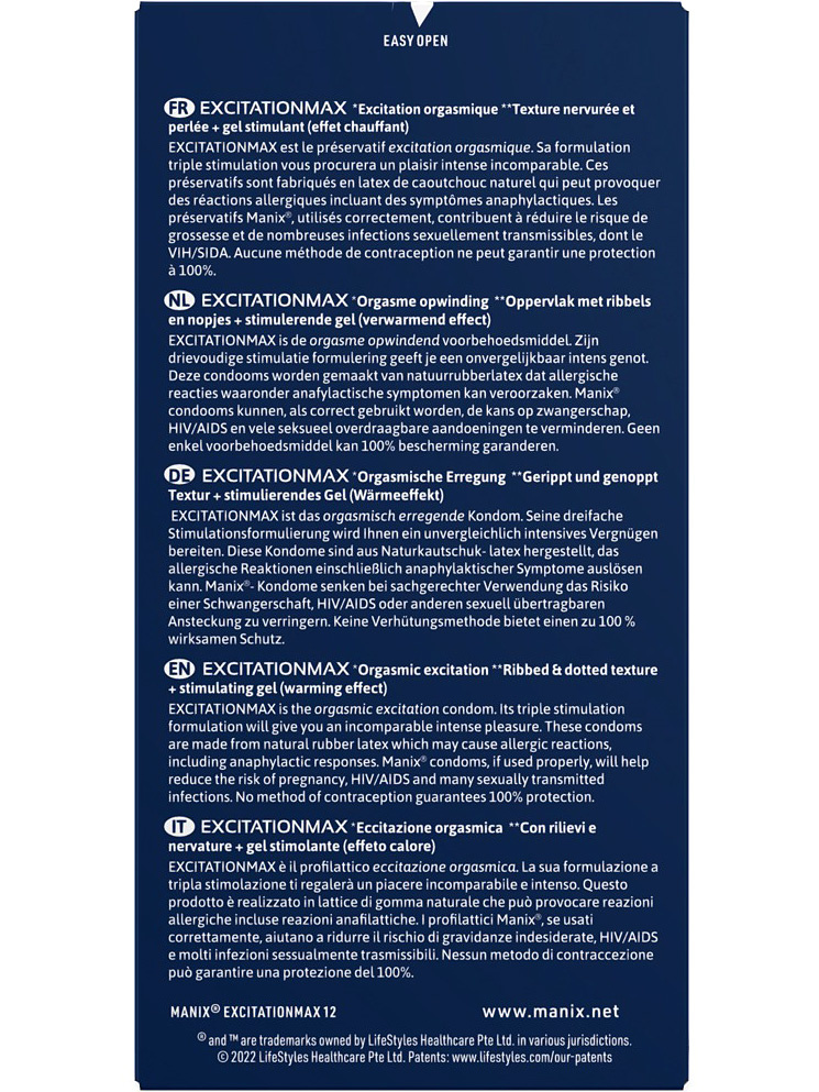 Vill du förstärka känslan och göra varje rörelse mer intensiv? Manix Excitation Max är stimulerande latexkondomer designade för att ge extra njutning – för er båda. Med en kombination av struktur, värmande glidmedel och anatomisk form är de skapade för att ta upplevelsen till nästa nivå.