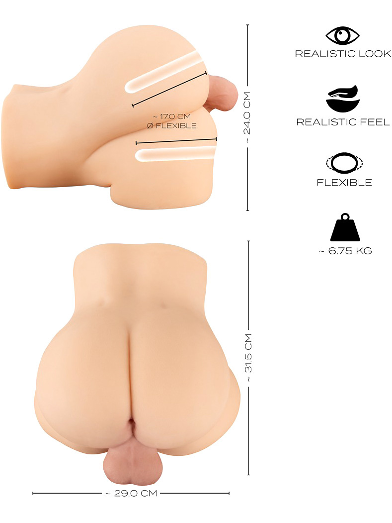 De två flexibla njutningstunnlarna – en vaginal och en anal – är utformade med stimulerande knottror och räfflor som intensifierar känslan vid varje rörelse. Med en vikt på över 6 kilo ligger torson stabilt på alla släta ytor, vilket ger dig frihet att växla positioner utan att förlora kontrollen.
