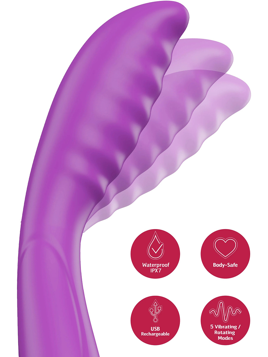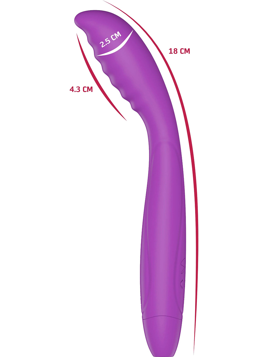 Vibratorn är tillverkad i mjukt, kroppssäkert silikon med en silkeslen yta som glider lent mot huden. Den ergonomiskt böjda formen gör det enkelt att nå G-punkten, medan den fasta basen ger stabilitet och kontroll även under intensiva stunder.