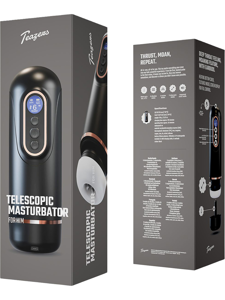 Upptäck en ny nivå av kontroll och variation med Teazers Telescopic Masturbator. Den här avancerade strokern kombinerar teleskopisk stroking-rörelse, sugfunktion och vibrationer i en och samma enhet – för en upplevelse som anpassar sig efter dig, varje gång. Dessutom har den en inbyggd ljudfunktion med sensuella stön och en uppvärmningsfunktion för realism.