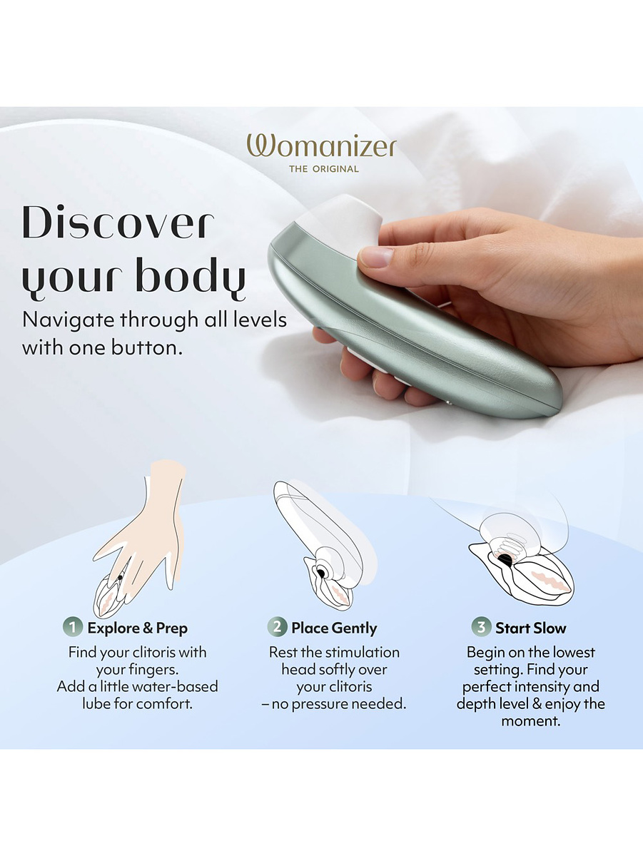 Dess kompakta design och enkla kontroller gör Womanizer Pro till en perfekt modell för dig som vill upptäcka lufttrycksstimulans för första gången.