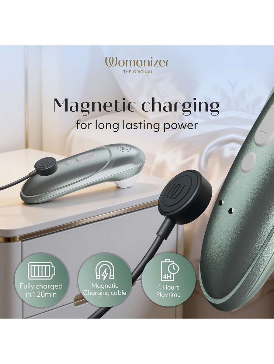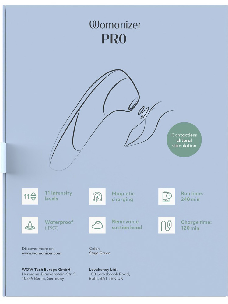 Womanizer Pro är vattentät (IPX7) vilket gör att den kan användas i både dusch och bad. Den laddas enkelt med den medföljande USB-kabeln och ger 4 timmars användningstid på en laddning.