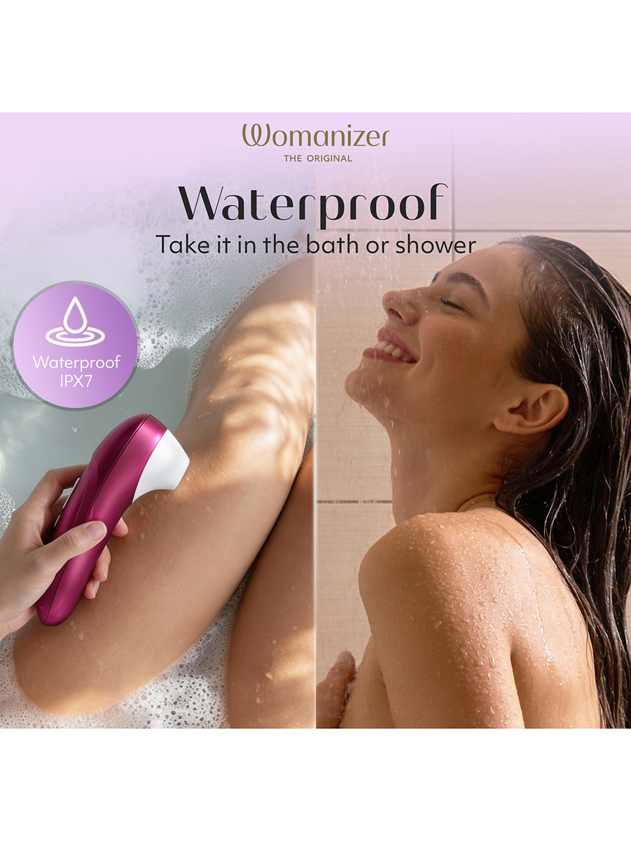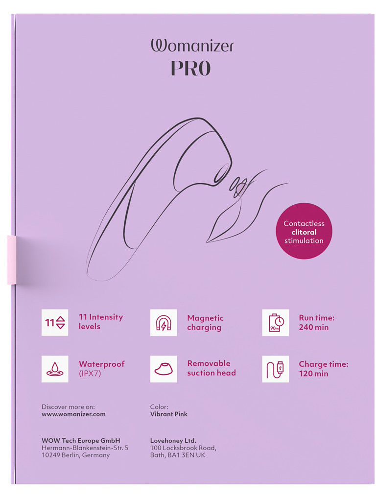 Womanizer Pro är vattentät (IPX7) vilket gör att den kan användas i både dusch och bad. Den laddas enkelt med den medföljande USB-kabeln och ger 4 timmars användningstid på en laddning.