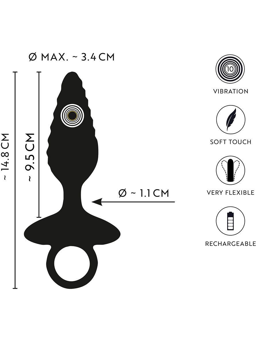 Pluggen är tillverkad i kroppssäkert, ftalatfritt silikon som är både mjukt och flexibelt. Den anpassar sig efter kroppen och rörelserna för en trygg och bekväm upplevelse. Den breda basen med en praktisk ringformad stopp fungerar som ett säkert handtag som gör leken enkel att kontrollera och förhindrar att pluggen förs in för långt.