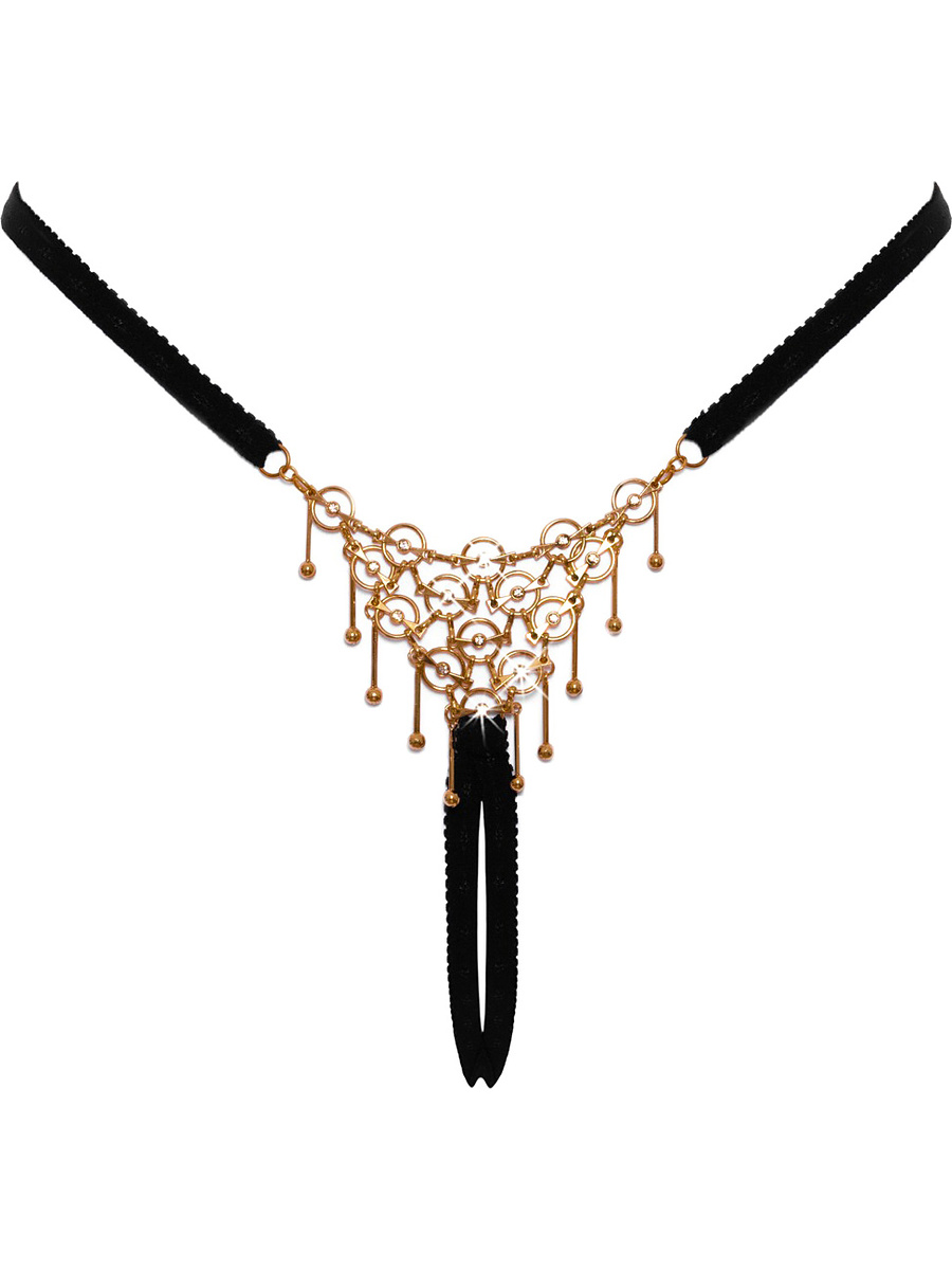 Dekorationen består av ringar, små kedjor, gnistrande stenar och svajande stavar med kulor i ändarna som rör sig lekfullt mot huden. Midjebandet är justerbart i sidorna för att sitta perfekt, och den öppna grenen gör den lika förförisk som praktisk för stunder som inte ska avbrytas.