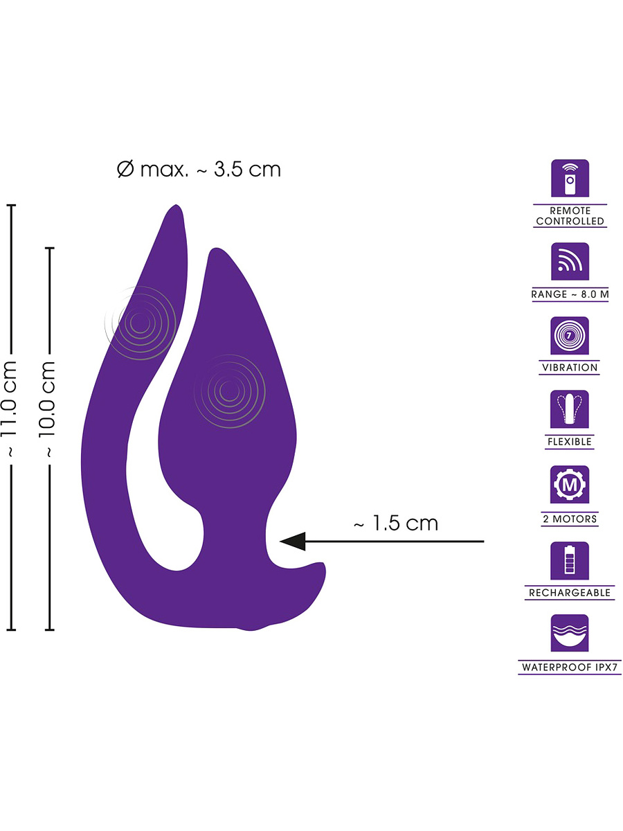 Den smidiga pluggen kan användas både vaginalt och analt och har en flexibel form som följer kroppens rörelser. Den yttre delen placerar sig mot klitoris eller perineum och ger kraftfull stimulans i harmoni med den inre delen. De två tysta motorerna arbetar synkroniserat för att skapa en fyllig känsla.
